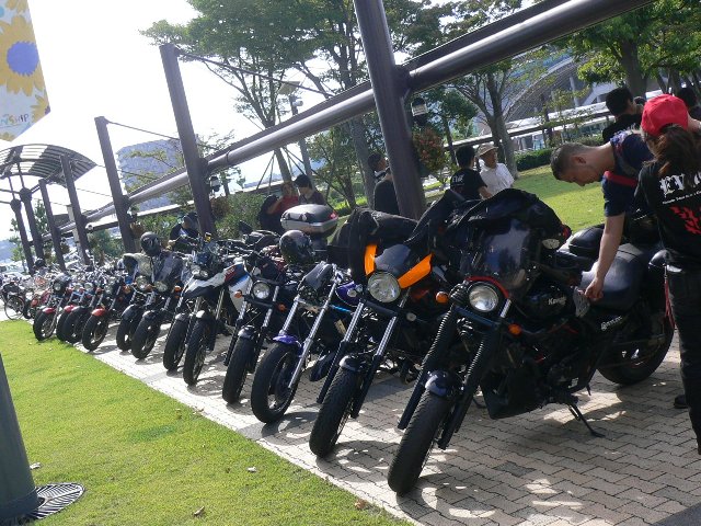さて続きをば、 ほぼ全員集まったので、集合写真を撮り 部屋に移動したところで開会式が始まりました(・∀・)ニヤニヤ 一通りの諸注意やらを説明し終わったら、 夕飯準備組とミニツー組に分かれます。 ウチはもちろんミニツー組ですヘ(゚∀゚ヘ)アヒャ ですが、 近畿支部幹事ってことで、先導に任命されました(;・∀・) 5分前に地図を渡され必死で暗記… 頼みの綱として、地元のショーケンさんに一応ルートを説明しておくww いよいよ出発… …やっぱ迷いましたよ:(;゙゚'ω゚'): そりゃ初めての地で十数台も先導ってのは無理無茶無謀ですよ(;´Д`) パイパス乗れてホッとしたところで一枚。 しかし、バイパス降りてから微妙に迷い(;´Д`) 絶妙に良い感じの道を通り、なんとか目的地に到着w 弁天島です。 アリガタヤアリガタヤ(-∧- ) と、あとは帰るだけなので、またホッとして一枚ww いやぁー爽快爽快(∀`*)ゞ みにくいですが、上の看板に浜名湖って書いてあります(*´Д`) 無事帰着し、浜名湖で泳ぐ気力もなくグターっとしてると 料理が続々と出てきました~。 鯛のカルパッチョ的な。 ワンツーセブンさん喜び過ぎw 降魔さんツマミ食いww もんま総長の乾杯の合図で宴会は始まり、夜は更けてくのであった… あ、らんでぃさん遅れて到着ですww いろいろ大変だったようで(;´∀`) でも残り福(ぉ 食べれて良かったですねぇ(・∀・)ニヤニヤ こうして宴会はドンドン盛り上がっていきました。 …これどんな状況でしたっけ??w つづく